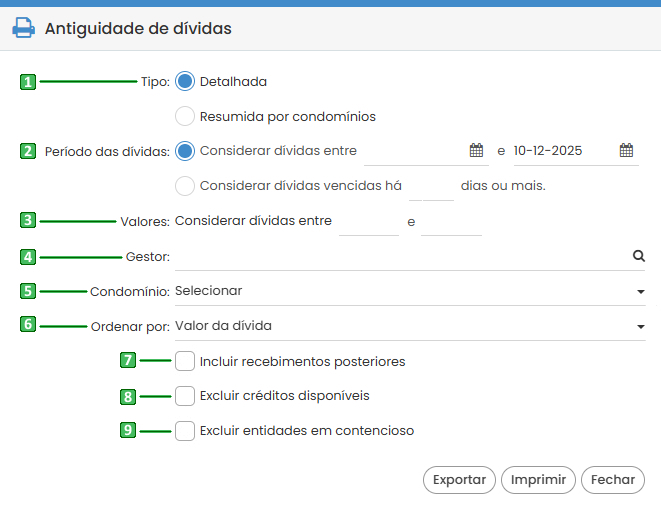 Permite limitar as dívidas a um período definido. Esta área oferece duas possibilidades, em que apenas uma poderá estar selecionada: