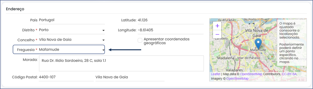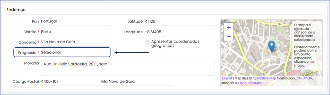 Competirá ao utilizador atualizar esta informação, acedendo ao formulário em modo de edição e preenchendo o campo pela nova designação da freguesia e, depois, gravar a informação: