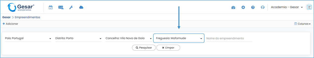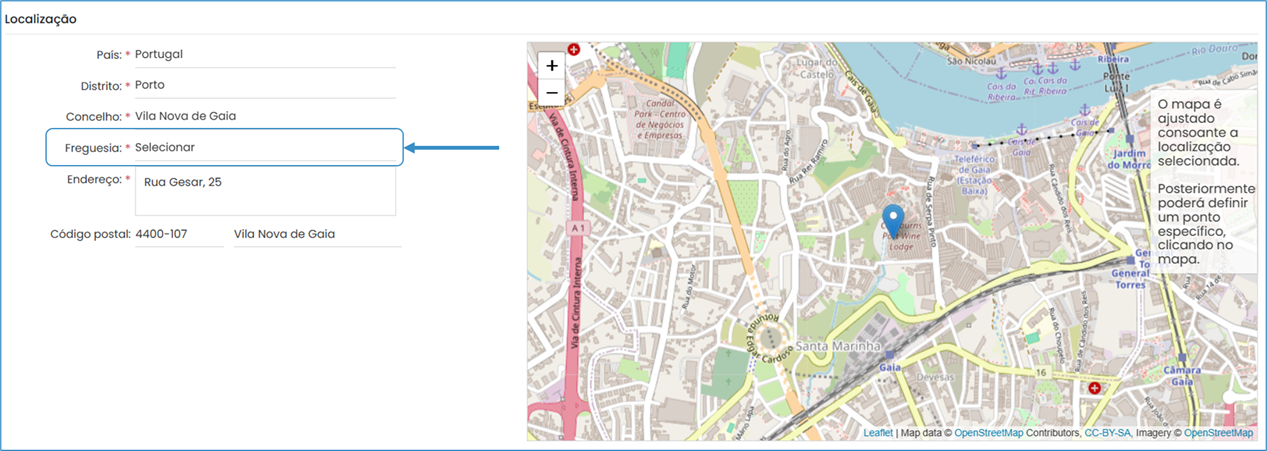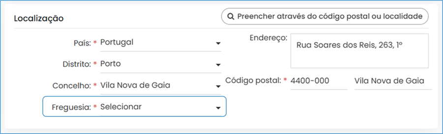 Nas fichas dos empreendimentos, no menu Imóveis ➜ Empreendimentos, no quadro Localização, existe um campo de preenchimento obrigatório, Freguesia que apresenta uma lista das freguesias existentes no Concelho selecionado previamente que, por sua vez, é carregado em função do Distrito.
