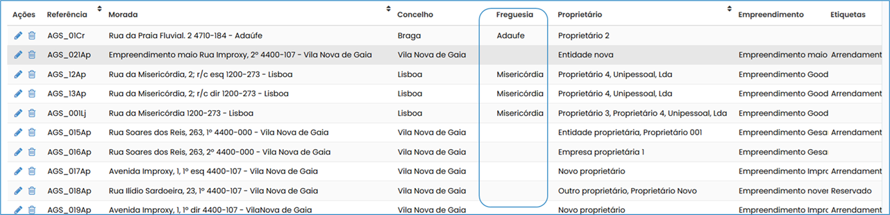 Para facilitar a identificação dos imóveis cuja freguesia foi alterada na lista de freguesias, o utilizador poderá aceder à lista de imóveis e verificar quais não têm freguesia registada- na listagem, esta informação estará omissa: