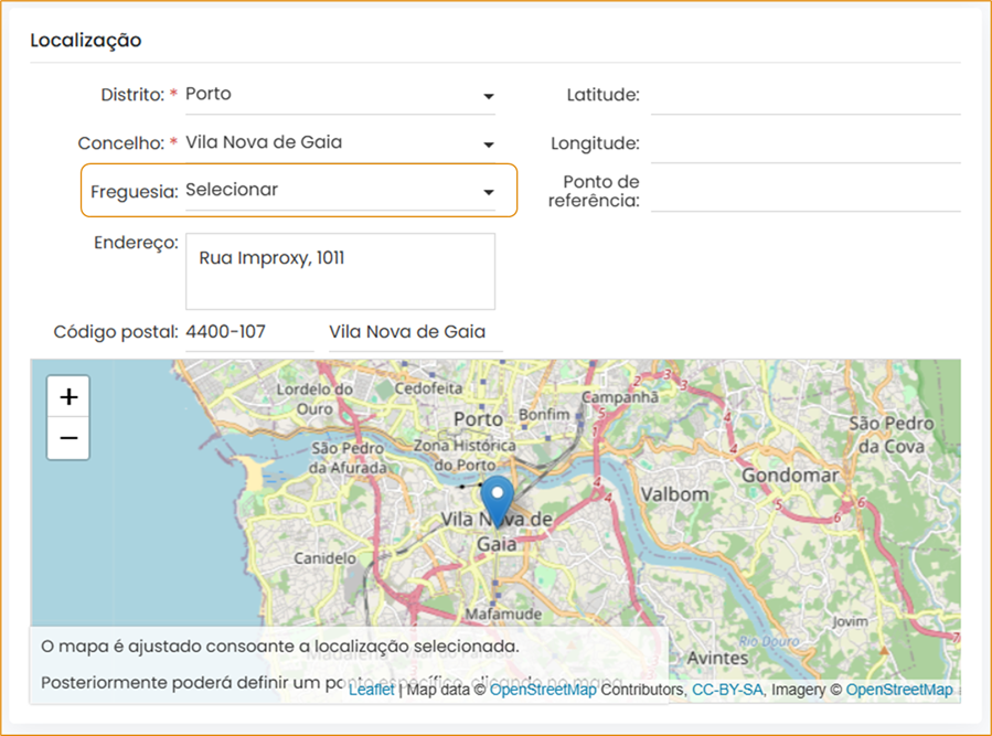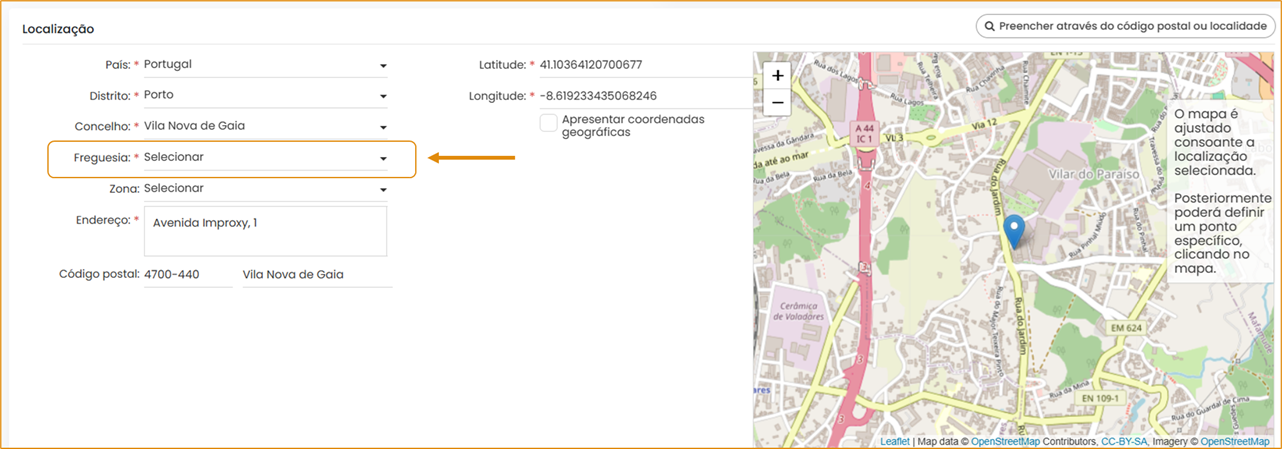 Nas fichas dos empreendimentos, no menu Empreendimentos, no quadro Localização, existe um campo de preenchimento obrigatório, Freguesia que apresenta uma lista das freguesias existentes no Concelho selecionado previamente que, por sua vez, é carregado em função do Distrito.