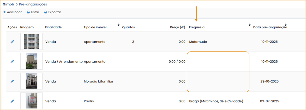 A identificação dos imóveis em pré-angariação cuja freguesia deve ser substituída é facilitada pela consulta da lista de pré-angariações:
