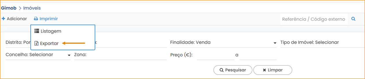 Caso pretenda, o utilizador poderá exportar a lista de imóveis em formato .csv, se entender que lhe facilita a pesquisa. Na listagem de imóveis deverá aceder à opção Imprimir e, nessa opção, escolher Exportar: