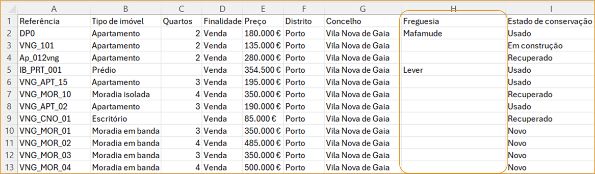 Será, então, gerado um ficheiro .csv com uma coluna Freguesia. As células desta coluna sem informação correspondem aos imóveis cuja designação da freguesia foi alterada.