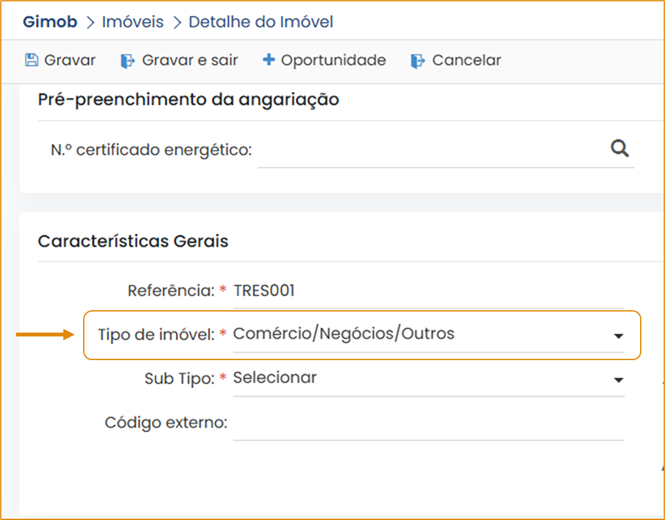 Registo de imóveis para trespassePara registar um imóvel cujo objetivo do negócio é o trespasse, o utilizador deve identificá-lo no campo Caraterísticas gerais ficha de registo do imóvel como sendo do tipo Comércio/Negócios/Outros: