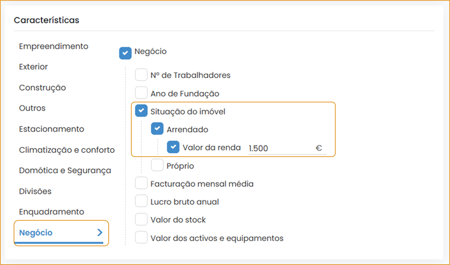Na árvore das Caraterísticas, ramo Negócio, deve ter selecionada a opção Situação do imóvel Arrendado e registado o Valor da renda: