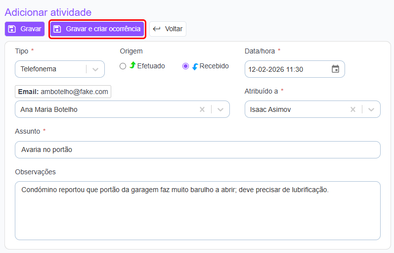 É possível criar uma ocorrência a partir do registo de uma atividade. Essa opção permite rentabilizar o tempo dispendido no processo, utilizando informação já disponível na atividade e replicando-a automaticamente na ocorrência.